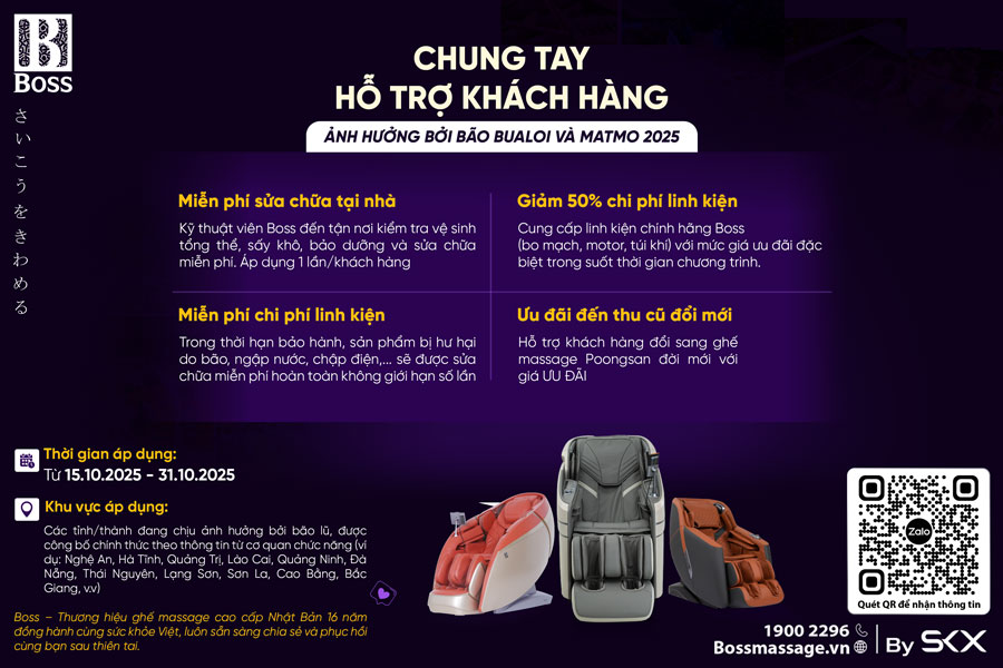Thấu hiểu những mất mát đó, với tinh thần Đồng hành – Sẻ chia – Cùng vượt khó, Boss chính thức triển khai chương trình hỗ trợ đặc biệt dành cho khách hàng có sản phẩm ghế massage Boss bị ảnh hưởng bởi bão lũ hoặc ngập nước. Đây là hành động thể hiện trách nhiệm xã hội và cam kết tận tâm của Boss – thương hiệu luôn đặt lợi ích và sự an tâm của khách hàng ở vị trí trung tâm trong mọi hành động.