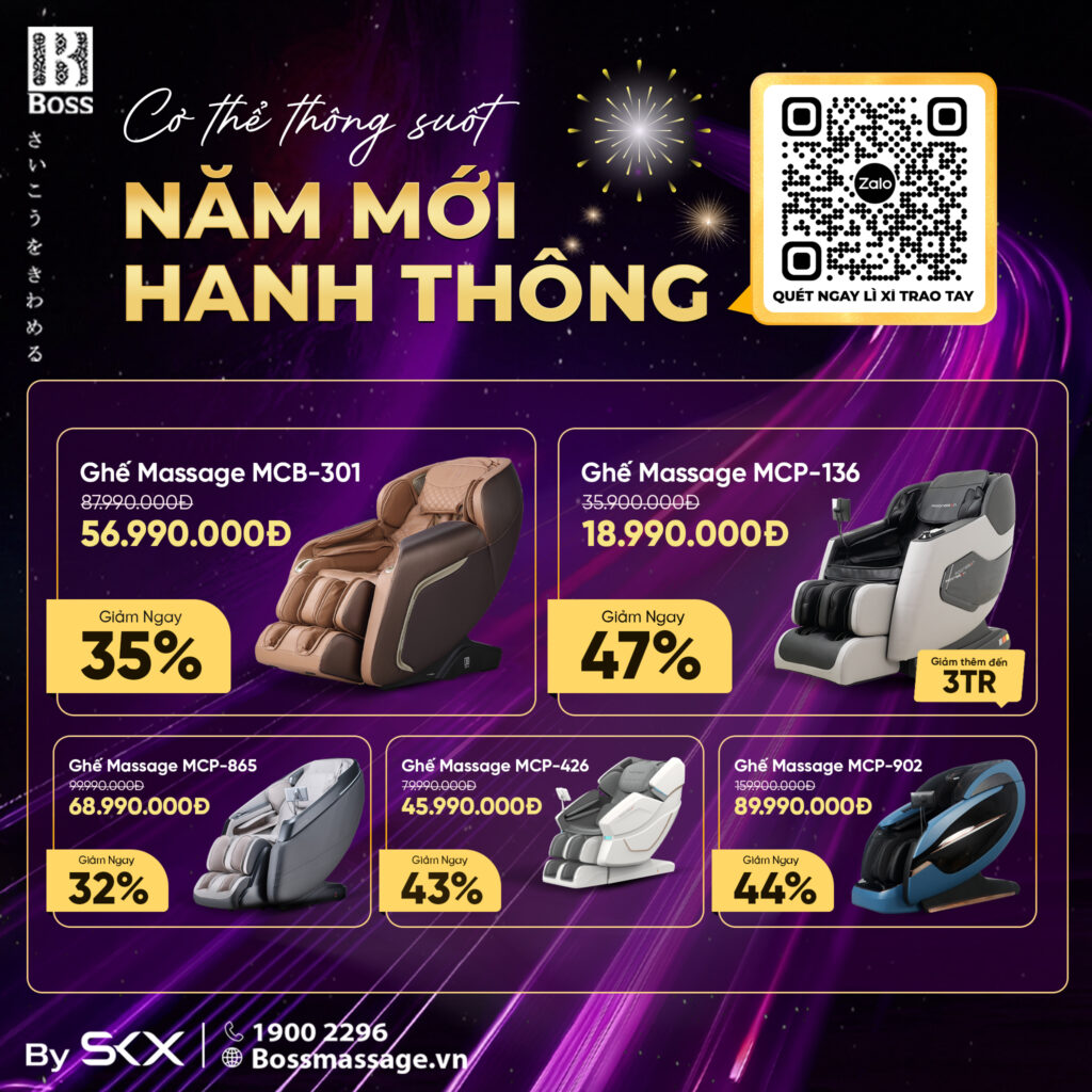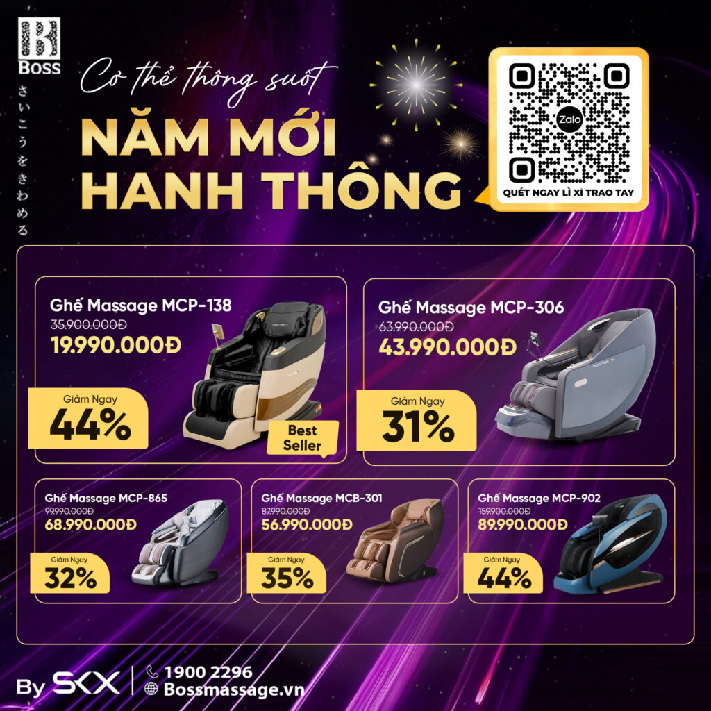 Tâm điểm của chương trình là các dòng ghế massage BOSS được áp dụng mức ưu đãi lên đến 80%. Ứng dụng công nghệ massage tiên tiến, ghế massage BOSS tập trung xử lý các vùng thường xuyên tích tụ căng cứng như cổ, vai, lưng và thắt lưng. Việc giải phóng áp lực cơ thể một cách rõ ràng và dứt điểm giúp trạng thái vận động trở nên nhẹ hơn, tinh thần minh mẫn hơn và nhịp sinh hoạt được đưa về quỹ đạo ổn định. Đây là nền tảng quan trọng để cơ thể duy trì sự thông suốt trong suốt năm mới.