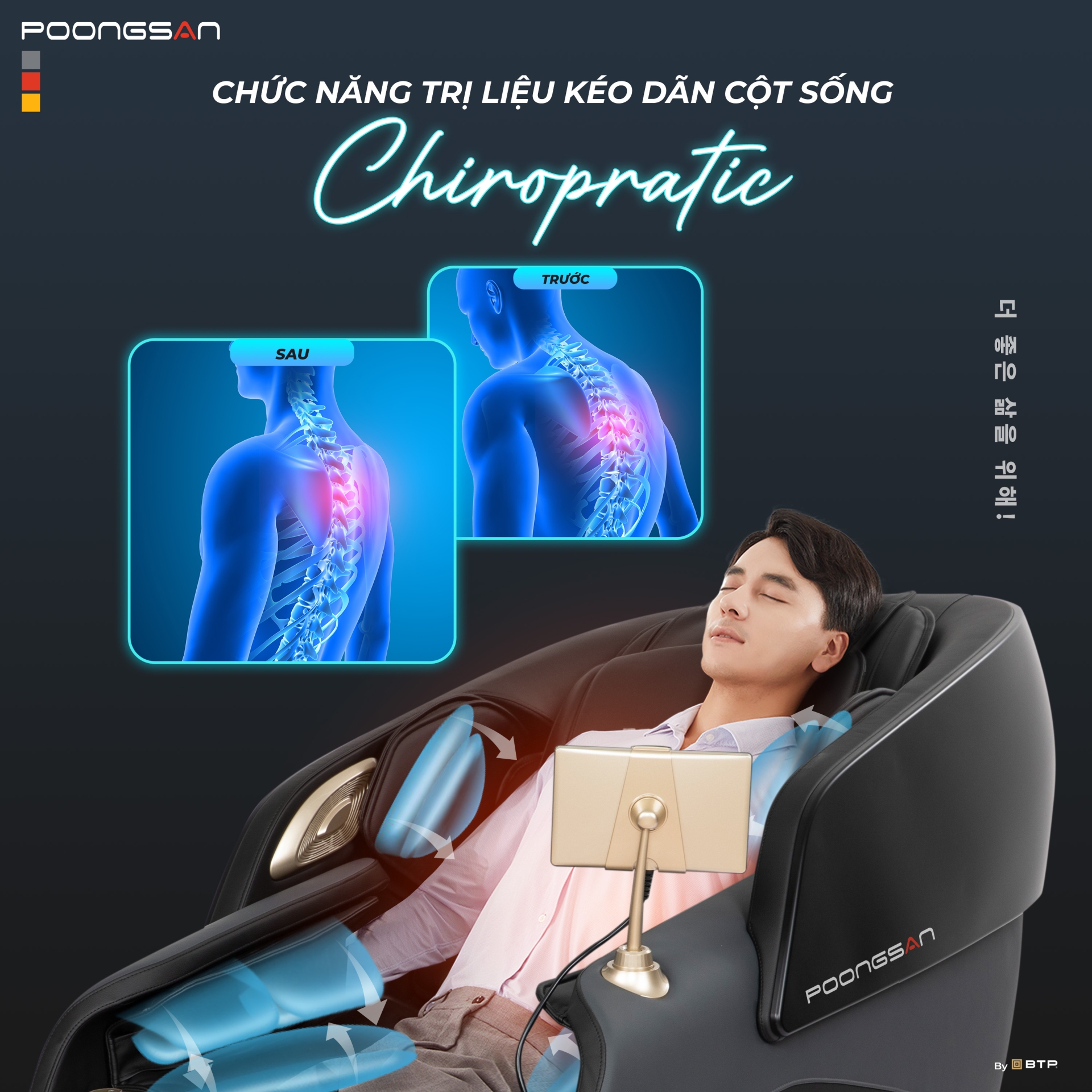 Ghế massage Poongsan MCP-152 được thiết kế với liệu pháp kéo dãn cột sống Chiropratic chuyên sâu , kết hợp cùng tư thế không trọng lực, giúp cơ thể được mở rộng và thả lỏng một cách tự nhiên trong quá trình sử dụng. Khi ghế ngả sâu, phần lưng và chân được nâng đỡ đồng đều, tạo cảm giác nhẹ nhàng và dễ chịu hơn.
