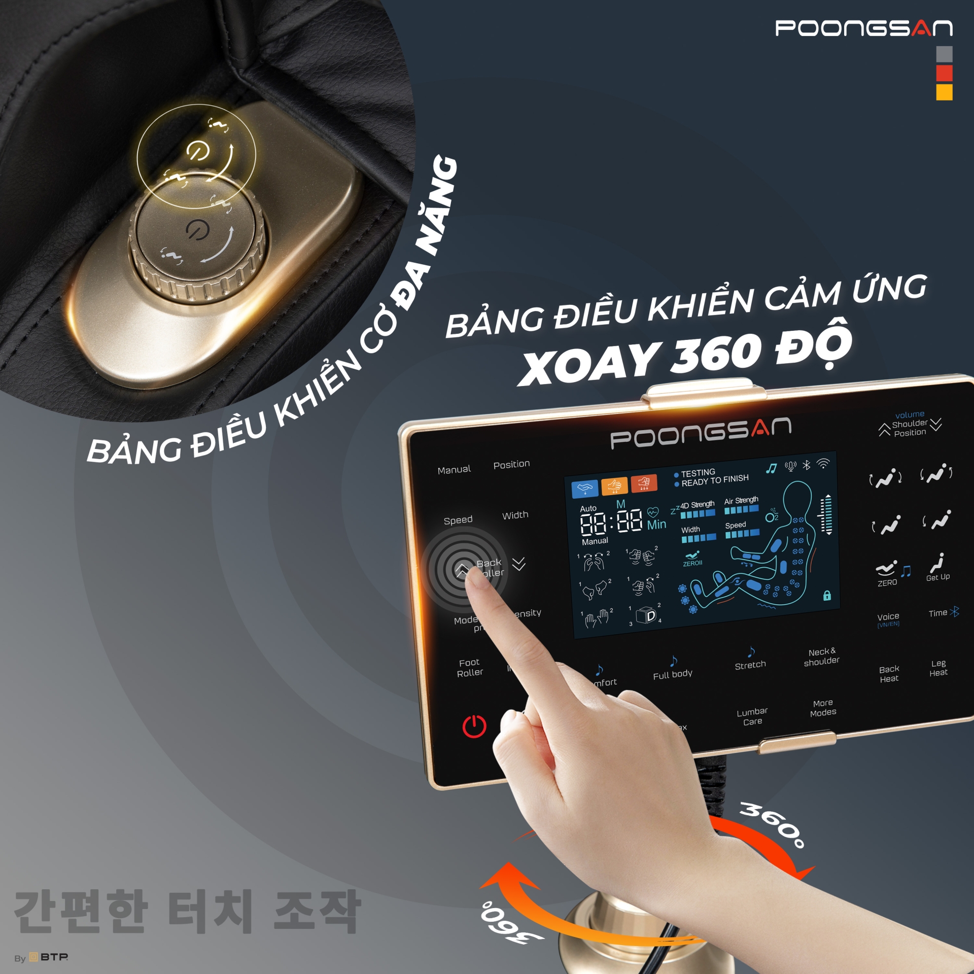Ghế massage Poongsan MCP-152 được trang bị màn hình LCD cảm ứng có khả năng xoay 360°, cho phép người dùng dễ dàng điều chỉnh góc nhìn phù hợp với tư thế ngồi hoặc nằm ngả. Giao diện hiển thị rõ ràng, trực quan, giúp việc lựa chọn chương trình và tinh chỉnh massage trở nên đơn giản hơn trong suốt quá trình sử dụng.