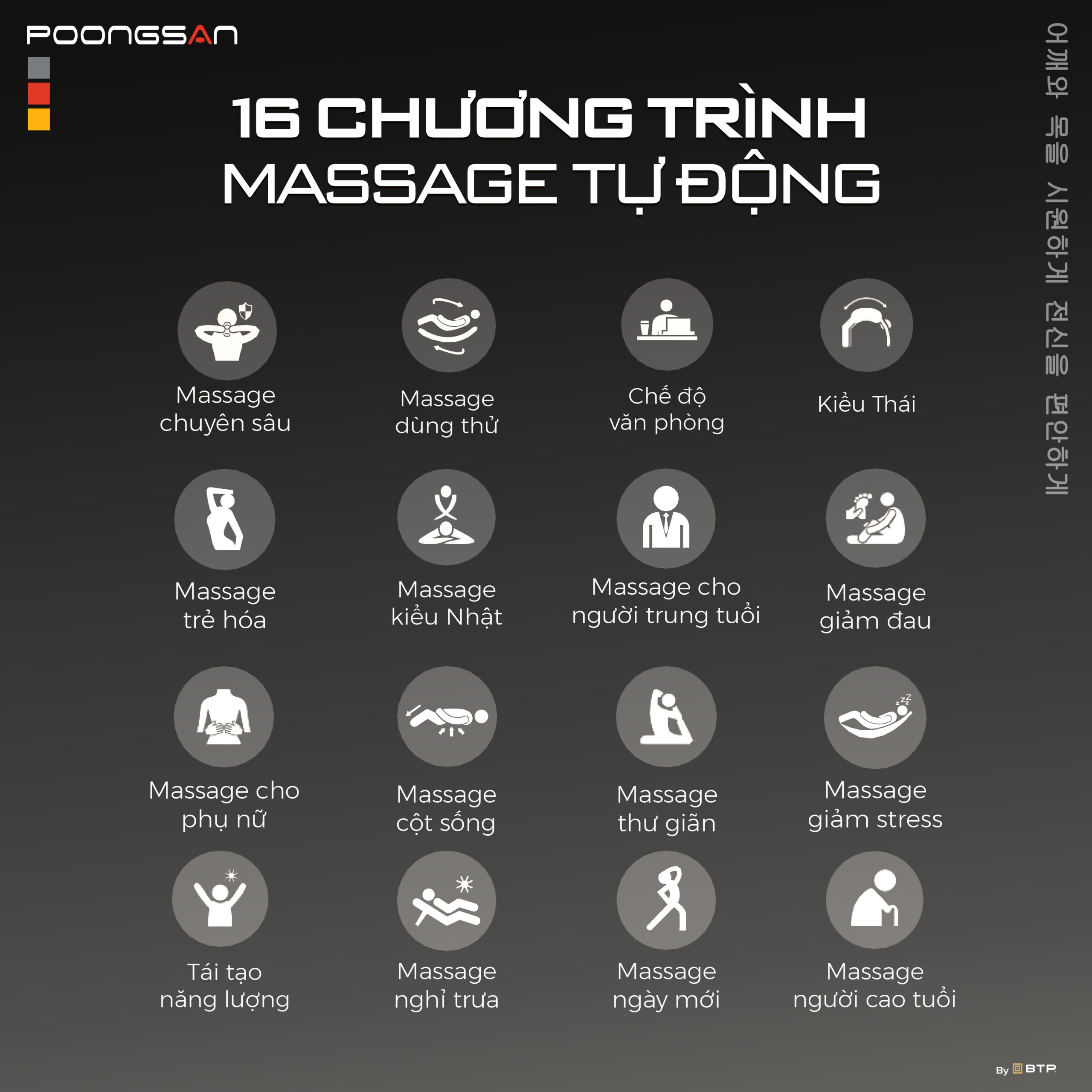 Ghế massage Poongsan MCP-906 nổi tiếng với 16 chương trình massage tự động đa dạng, được thiết kế để đáp ứng mọi nhu cầu và sở thích của người dùng. Mỗi chương trình massage tự động được thiết kế bởi các chuyên gia, mô phỏng các kỹ thuật massage truyền thống và hiện đại, mang đến những trải nghiệm massage chuyên sâu và đa dạng.