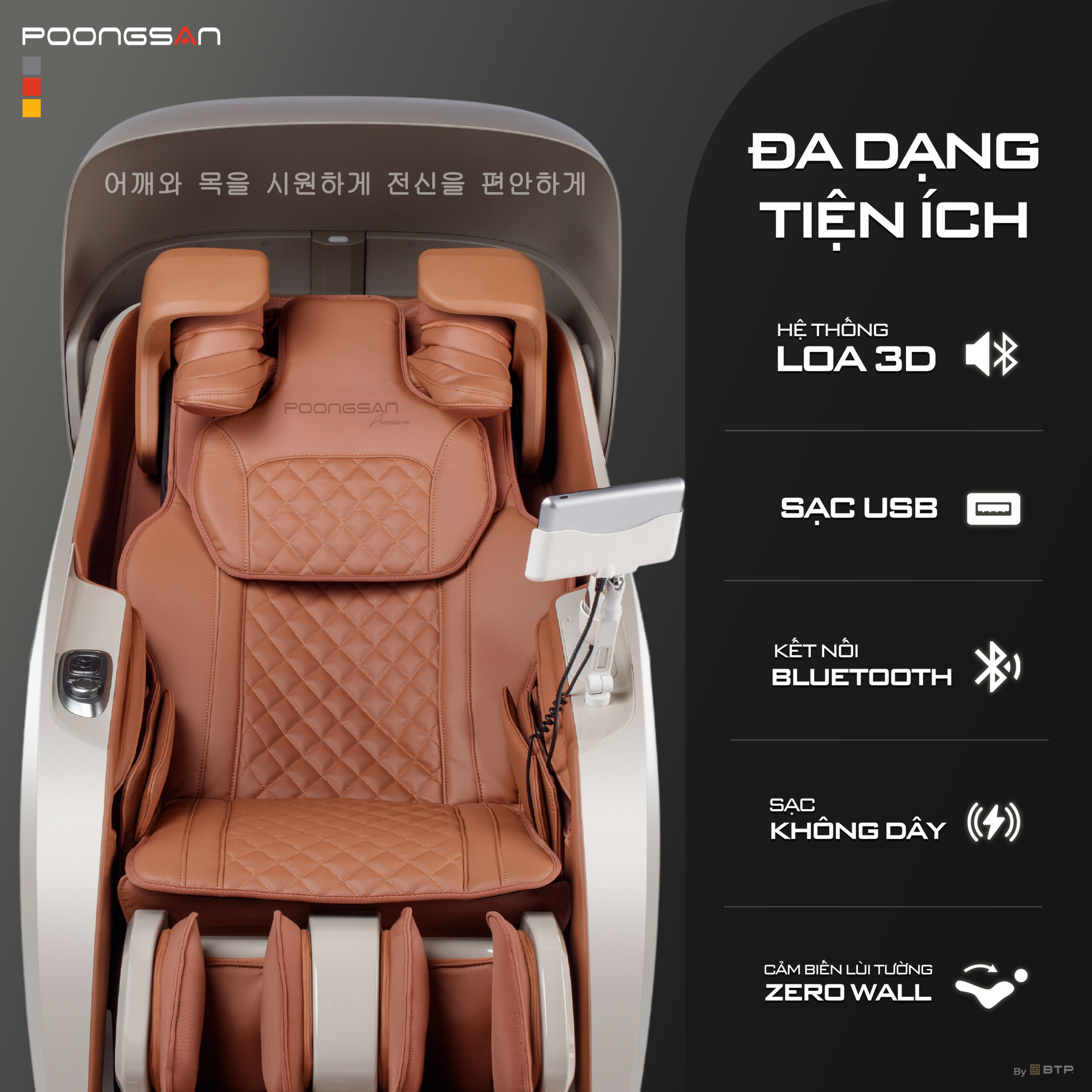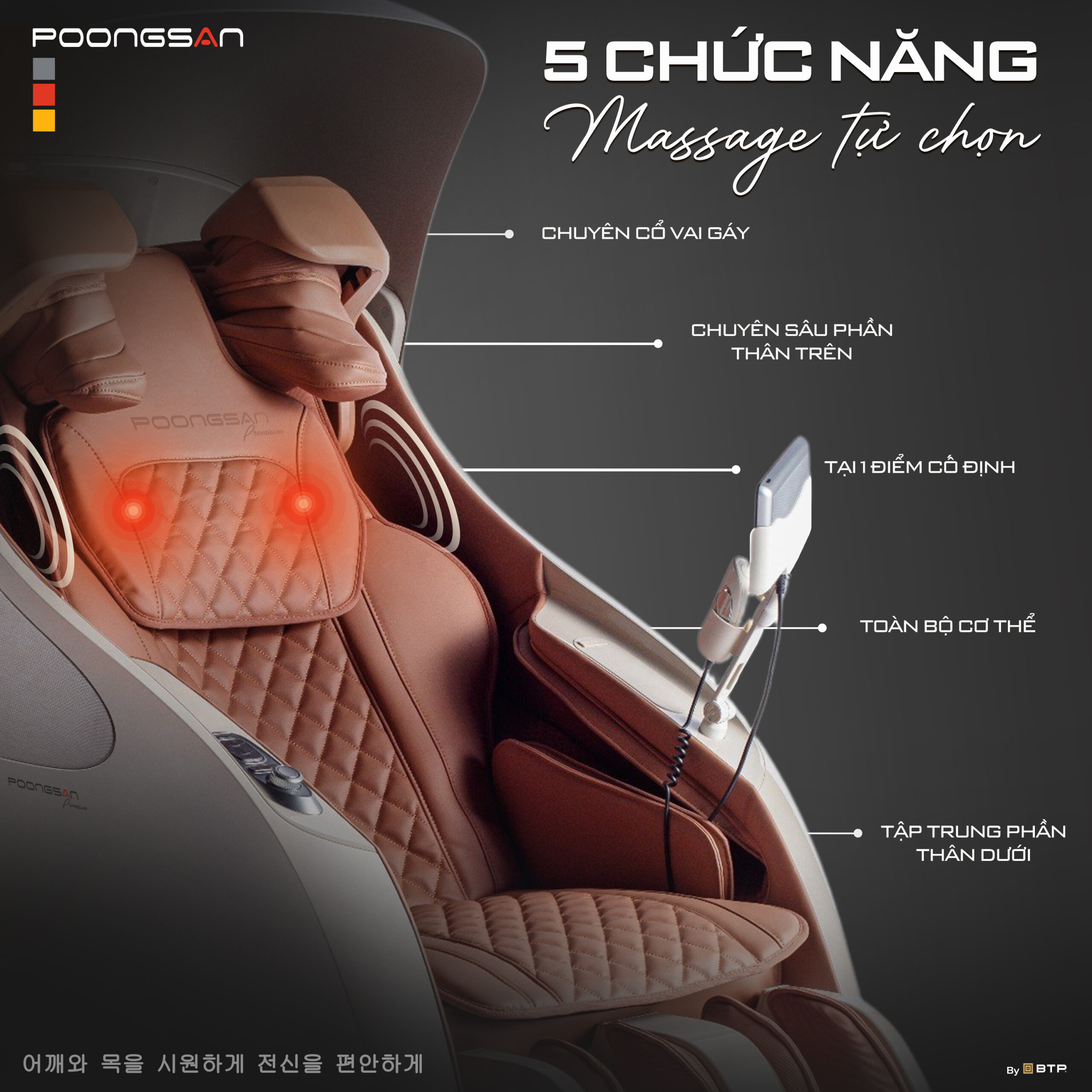 Ghế massage Poongsan MCP 906 còn được đánh giá cao nhờ sở hữu đa dạng các tính năng thông minh, mang đến trải nghiệm massage chuyên nghiệp và tiện nghi: