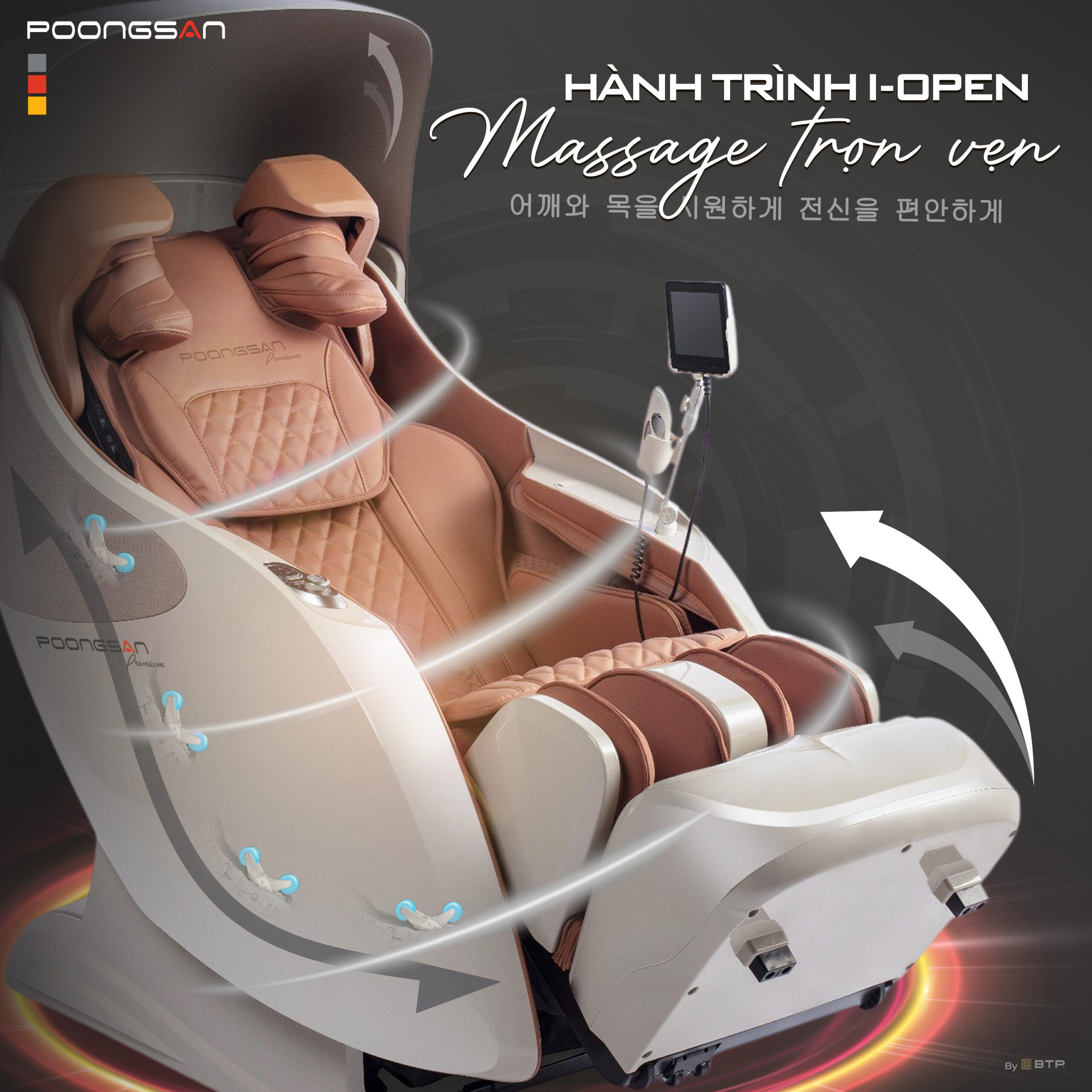 Hành trình I-Open là một trong những công nghệ nổi bật nhất mà ghế massage Poongsan MCP 906 sở hữu. Công nghệ này mang đến những trải nghiệm massage toàn diện và chân thực hơn so với các dòng ghế massage thông thường. Với ray trượt có chiều dài lên tới 138cm cùng khả năng mở rộng góc lên đến 168 độ, ghế giúp bao phủ gần như toàn bộ chiều dài cơ thể. Điều này giúp con lăn massage di chuyển linh hoạt từ vùng cổ vai gáy đến tận bắp chân.